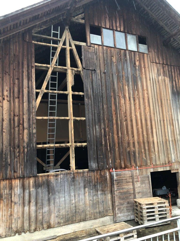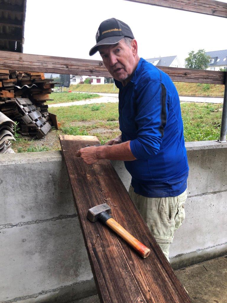 Nun ist es so, dass Markus und Irene Schmitter ihren nahegelegenen Landwirtschaftsbetrieb mit der verdienten Pension aufgegeben haben und den Kuhstall mit Scheune abgerissen wird. Hier ist eine Menge Holz vorhanden, an dem wir uns netterweise bedienen durften. Hier gilt: Nicht verschwenden -> wiederverwenden!